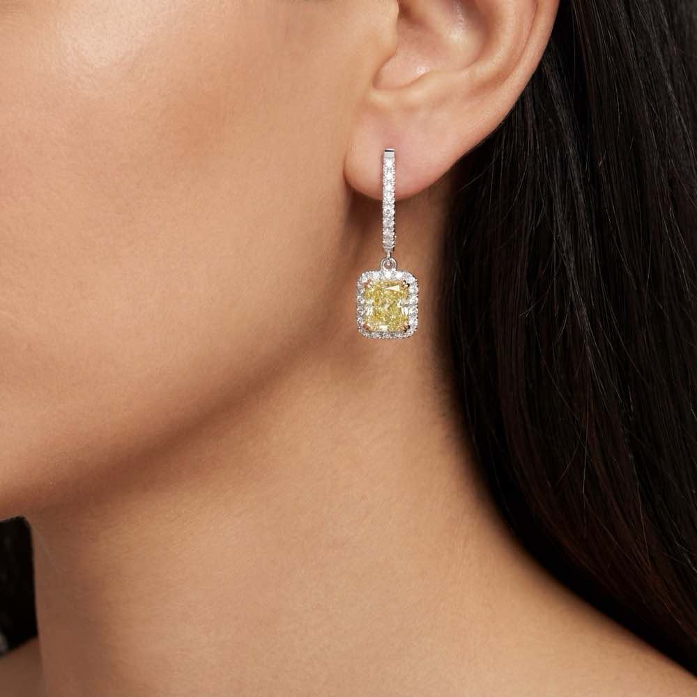 Außergewöhnlicher Ohrschmuck mit zwei fantasiefarben gelben Diamanten im Radiant-Schliff und fein weißen Diamanten im Brillantschliff. In feiner Handarbeit aus Platin 950/- gefertigt.
