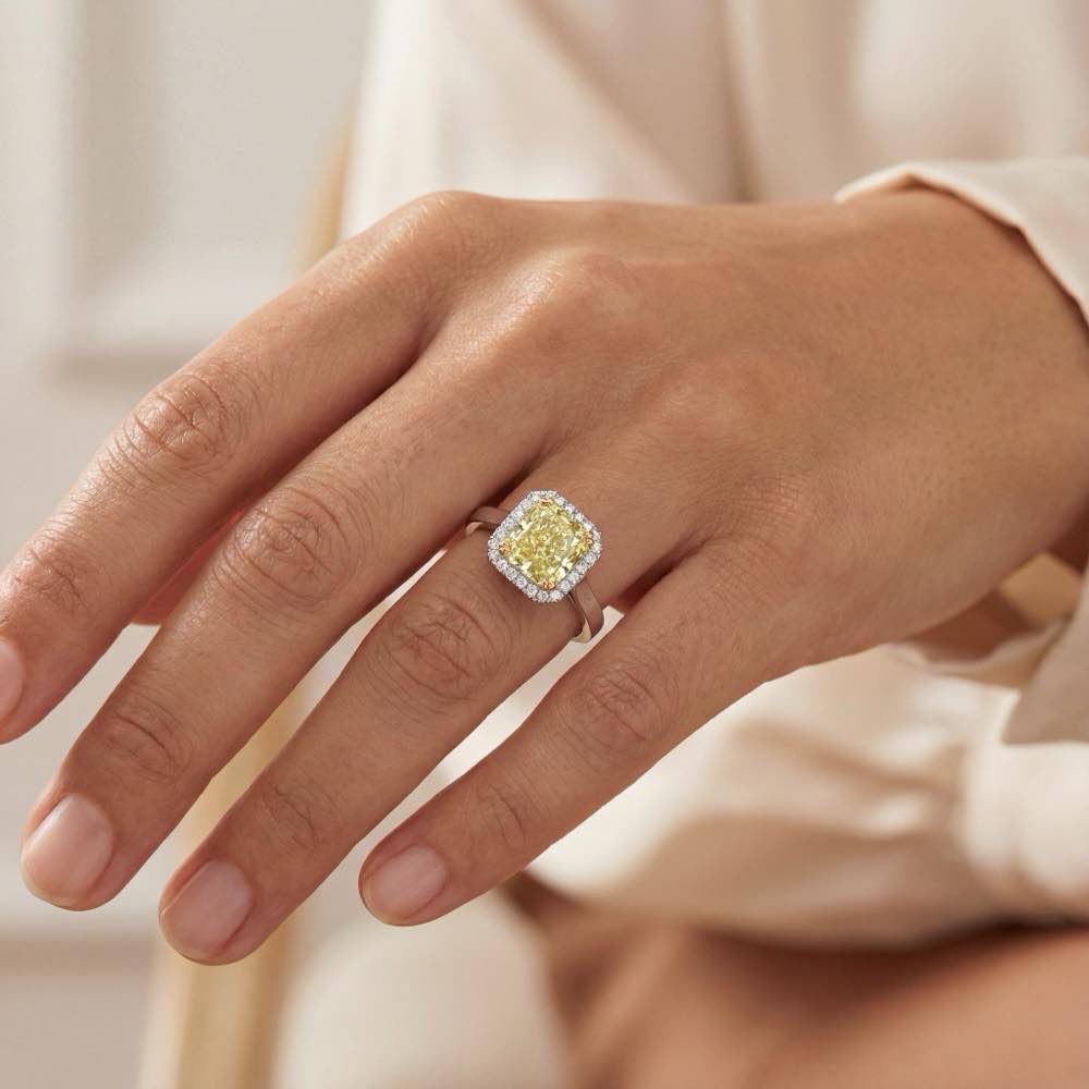 Er ist der Temperamentvollste, der Wertvollste und auch der Schönste: Der Diamant als König der Edelsteine zeigt sich stets in strahlendem Glamour. Noch glanzvoller gibt er sich in Farbe als fantasiefarbener Diamant oder Fancy Diamond. Während die farblosen Diamanten nahezu ausschliesslich aus Kohlenstoff bestehen, mischen sich bei der Entstehung von fantasiefarbenen Diamanten weitere Elemente ein, was sie – ab einer gewissen Farbintensität – extrem selten macht. Bei diesem betörenden Ring ist der Gelbton außergewöhnlich intensiv und lebendig in der Brillanz. Und genau das macht die einmalige Qualität eines Fancy Diamond aus. Je intensiver die Farbe, umso selterner ist er. Der fantasiefarben gelbe Diamant besitzt ein Zertifikat des weltweit führenden GIA (Gemolocical Institute of America).