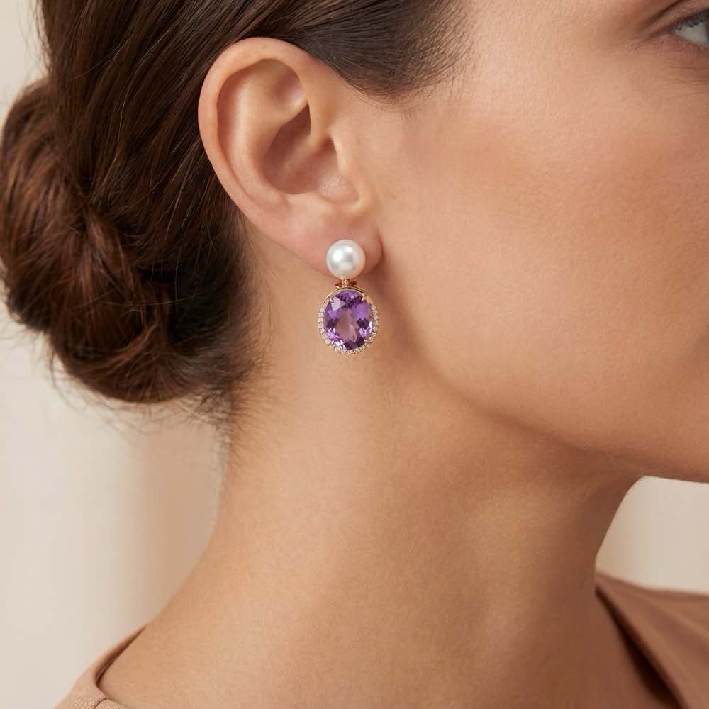 Traumhafter Ohrschmuck mit violett leuchtenden Amethysten und Südseeperlen. Die fein weißen Diamanten unterstützen die geheimnisvolle Anmutung der Amethysten. In hochwertigem 18-karätigem Roségold  gearbeitet sind diese Ohrringe ein außergewöhnlicher eye-catcher.
