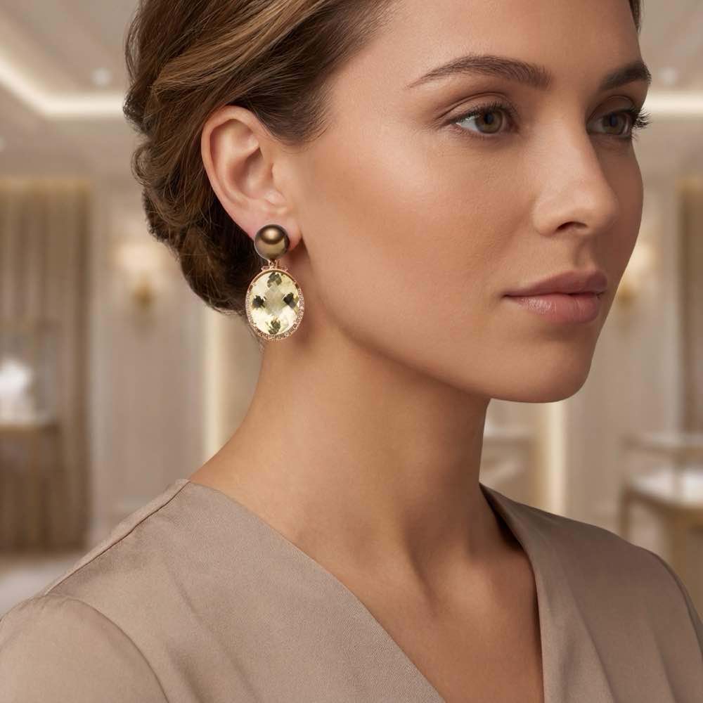 Traumhafter Ohrschmuck mit leuchtenden Citrinen und Südseeperlen. Die braunen Diamanten unterstützen die geheimnisvolle Anmutung der Citrinen. In hochwertigem 18-karätigem Roségold gearbeitet sind diese Ohrringe ein außergewöhnlicher eye-catcher.