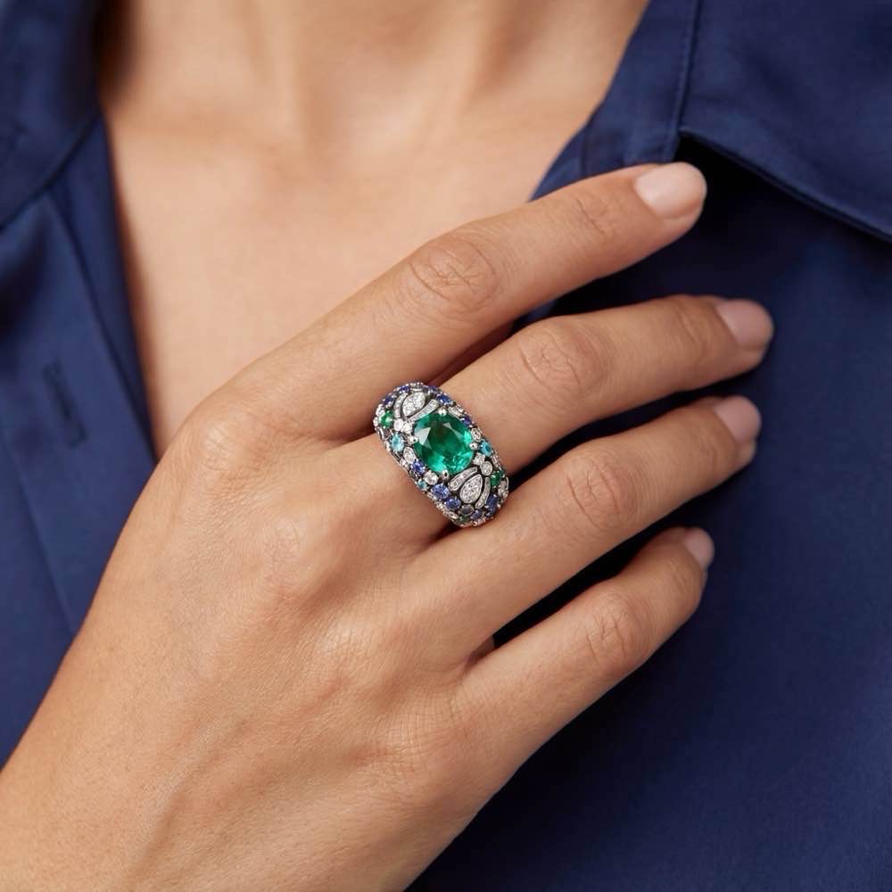 Einzigartiger Ring mit einem leuchtend grünen Turmalin im Zentrum, intensiv blauen Saphiren,  sehr seltenen und strahlend türkisblauen Paraibaturmalinen sowie einigen grün glänzenden Tsavoriten. Darüber hinaus verleihen fein weiße Diamanten im runden Brillantschliff diesem faszinierenden Unikat, handgefertigt aus hochwertigem Weißgold 750/-, zusätzlich eine besonders edle und lebensfrohe Ausstrahlung.