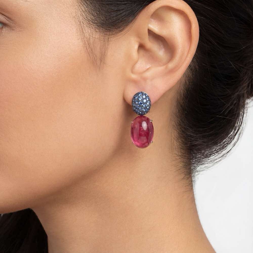 Bezaubernder Ohrschmuck mit zwei pink leuchtenden Rubelliten im Cabouchon-Schliff und zahlreichen klaren, hellblauen Saphiren. Ausdrucksstark und zugleich charmant begeistert dieser einzigartige Ohrschmuck, akkurat gefertigt in feinster Handarbeit aus hochwertigem Weißgold 750/-.