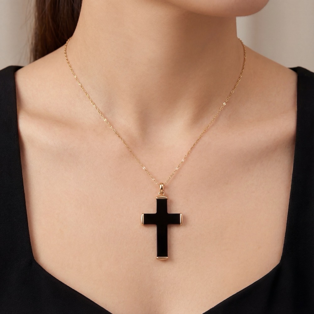 Dieser aus 18 Karat Roségold gefertigte Anhänger präsentiert einen als Kreuz geschliffenen Jet-Stein, der für geheimnisvolle Tiefe und zeitlose Eleganz steht. Die klare Form und der markante Kontrast zwischen warmem Gold und tiefem Schwarz machen ihn zu einem ausdrucksstarken Statement-Piece. Perfekt für Liebhaber luxuriöser Individualität und ikonischer Designs. Preis zzgl. Kette.