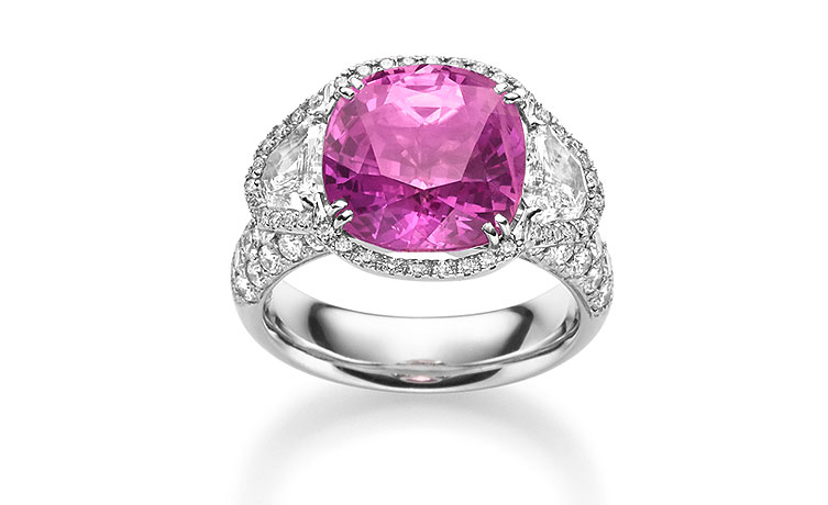 Ausgangspunkt für einen Schmuckentwurf ist sehr häufig ein besonderer Mittelstein. In diesem Fall ein hochfeiner, pinkfarbener Saphir von 11,60 ct.. Pinkfarbene Saphire sind um ein Vielfaches seltener als die mehr bekannten blauen Saphire, obwohl auch diese in feinen Qualitäten schon rar sind. Genauso wie sich um die Hauptperson eines Filmepos eine dramaturgische Geschichte aufbaut, so rankt sich um einen feinen Edelstein ein Schmuckdesign. „Die Natur der Edelsteine und insbesondere ihre Schliffform gibt unserem Design eine wichtige Vorgabe, an der wir uns immer orientieren“ erklärt Sandra Baireder. Denn der Edelsteinschleifer bearbeitet einen Edelstein immer mit dem Ziel, die beste Farbe aus ihm herauszuholen. Wird der Edelstein zu flach geschliffen, kann die schöne Farbe des Steins viel an Intensität verlieren. Daher werden die meisten, sehr wertvollen Edelsteine mit einem bauchigen Unterteil geschliffen, wie der Experte sagt. Dadurch wird besonders viel Farbe nach oben hin zum Betrachter reflektiert.
