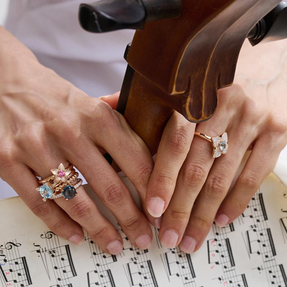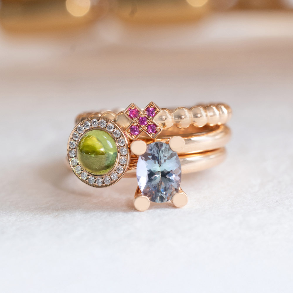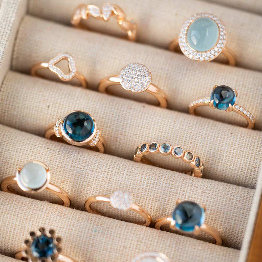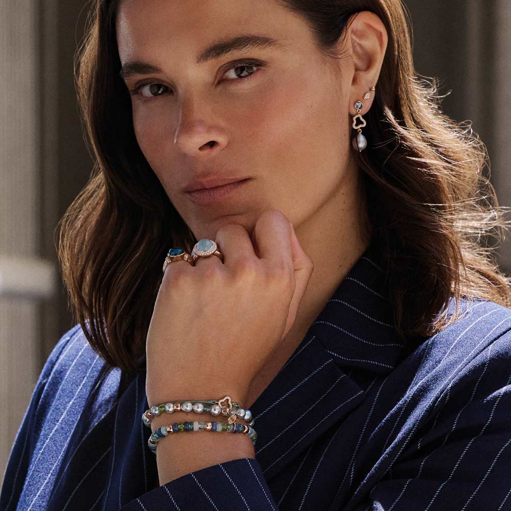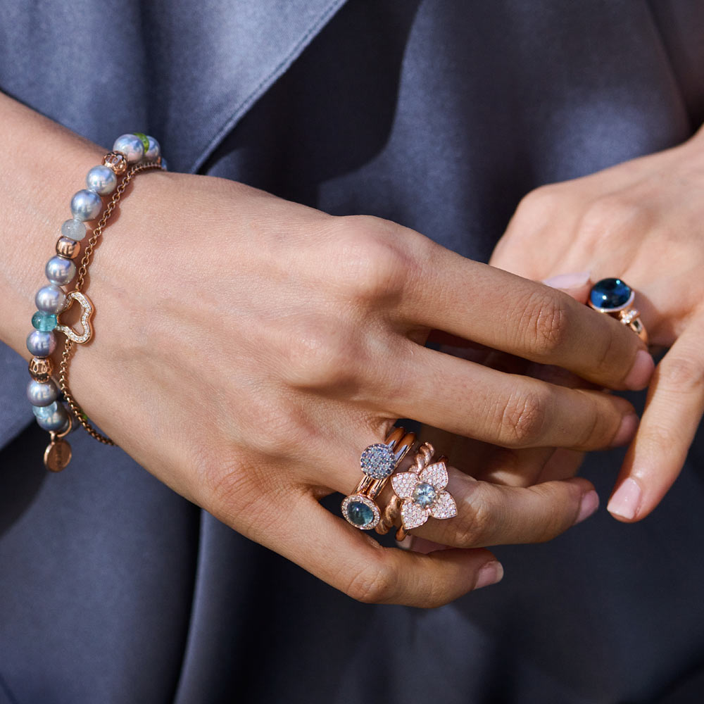 Aquamarin, Tansanit und Blautopas verschmelzen zu einem lebendigen Spiel aus Farbe und Licht. Die Designs sind für vielseitiges Kombinieren gedacht: Im Mix & Match entstehen immer neue Looks, ergänzt durch frische Akzente in Rosa und Grün – modern, individuell und ausdrucksstark.