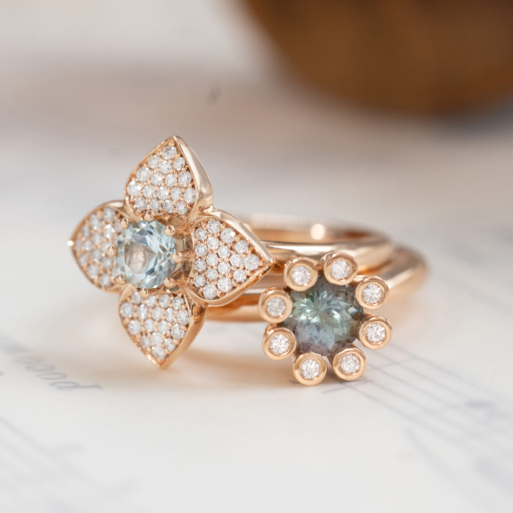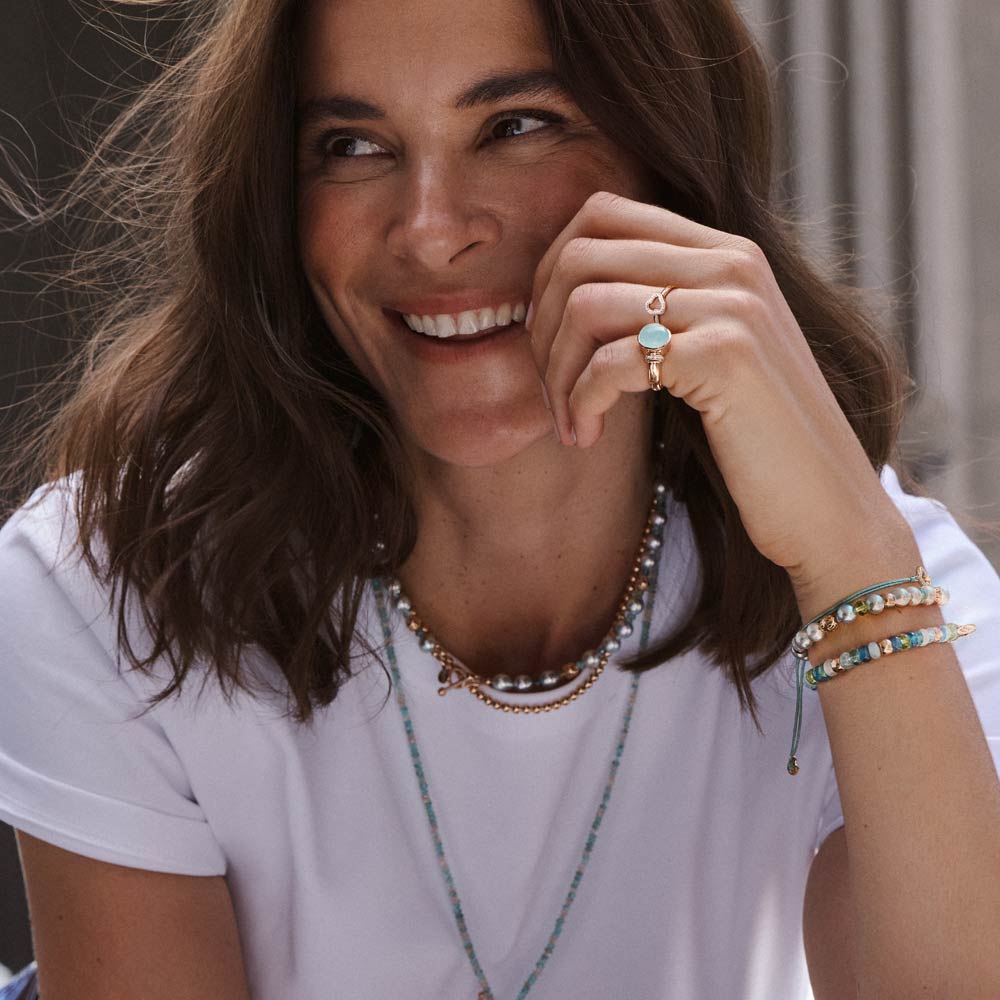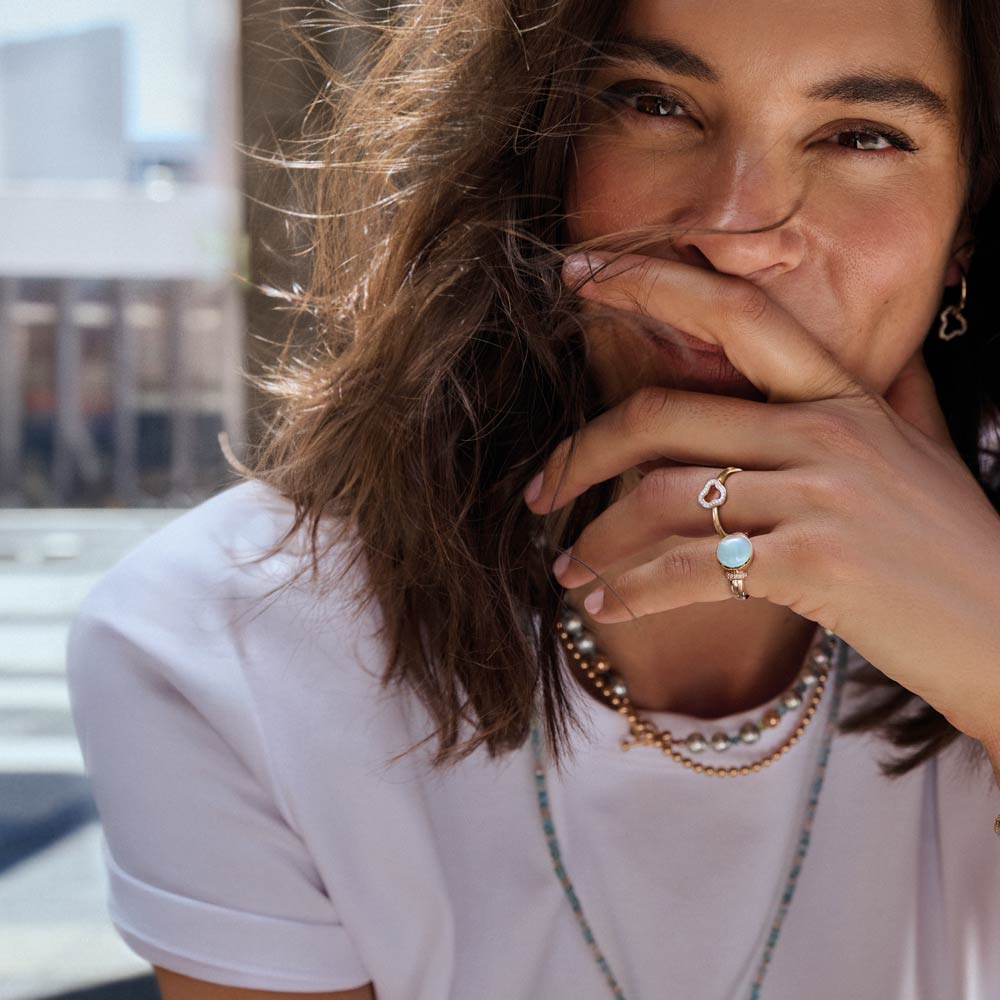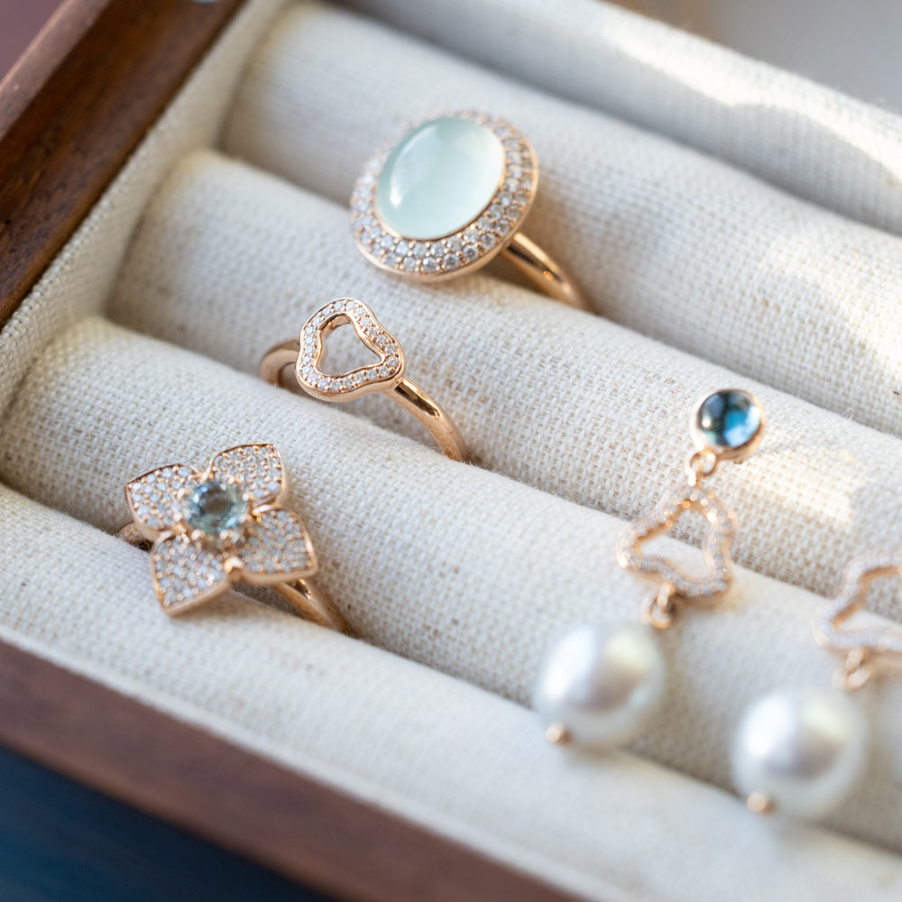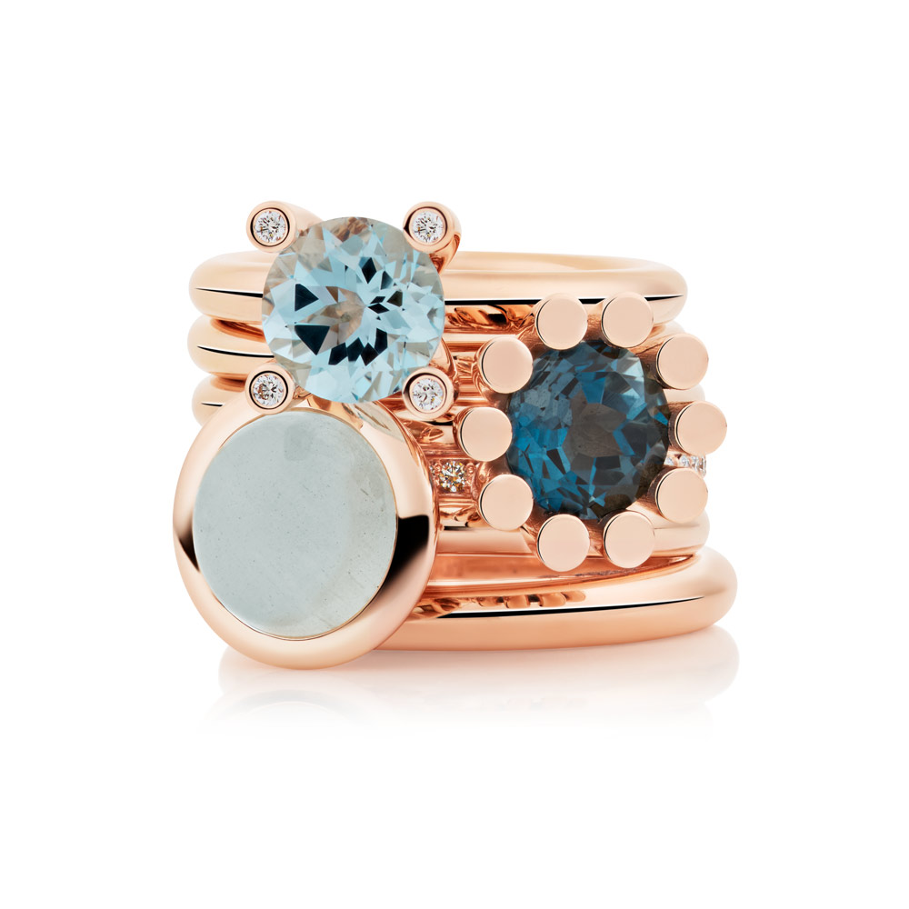 Aquamarin, Tansanit und Blautopas verschmelzen zu einem lebendigen Spiel aus Farbe und Licht. Die Designs sind für vielseitiges Kombinieren gedacht: Im Mix & Match entstehen immer neue Looks, ergänzt durch frische Akzente in Rosa und Grün – modern, individuell und ausdrucksstark.