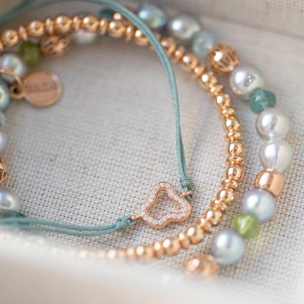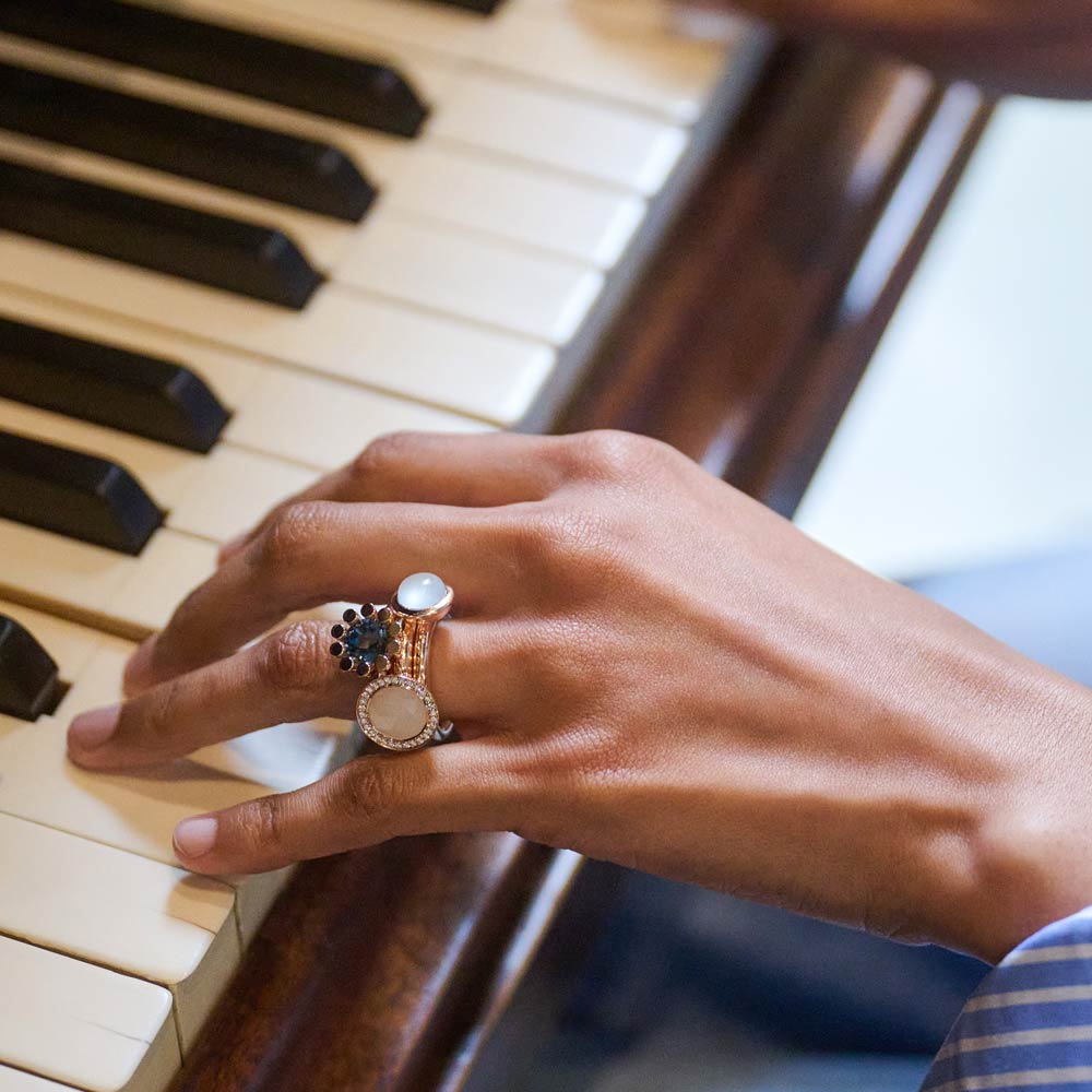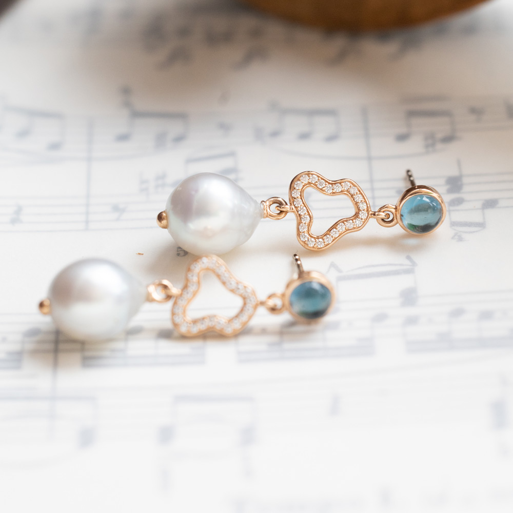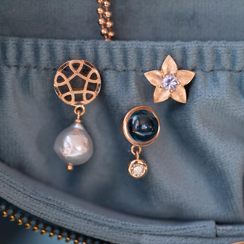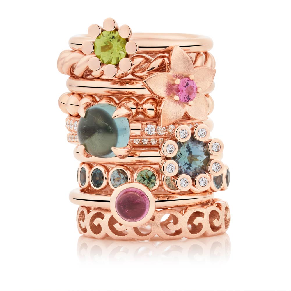 Aquamarin, Tansanit und Blautopas verschmelzen zu einem lebendigen Spiel aus Farbe und Licht. Die Designs sind für vielseitiges Kombinieren gedacht: Im Mix & Match entstehen immer neue Looks, ergänzt durch frische Akzente in Rosa und Grün – modern, individuell und ausdrucksstark.