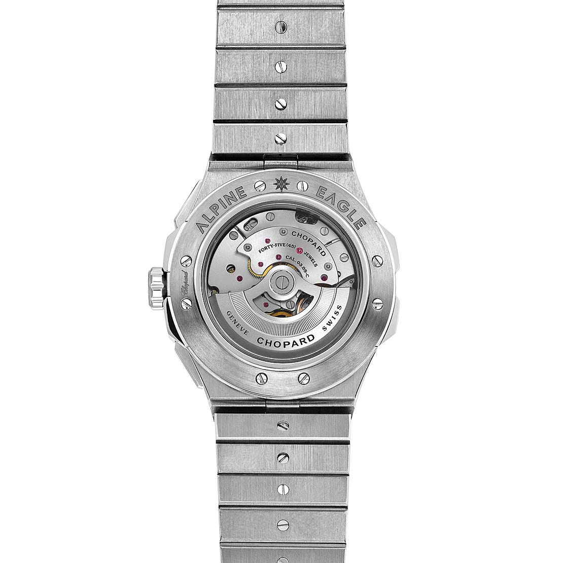 Die von drei Generationen der Familie Scheufele erdachte Kollektion Alpine Eagle interpretiert die erste Uhrenkreation von Karl-Friedrich Scheufele mit Modernität neu. Mit ihrem puristischen und selbstsicheren Design widerspiegelt die Kollektion Alpine Eagle den kreativen Reichtum, den visionären Geist und das ethische Engagement von Chopard genauso, wie sie von der Kraft der Natur inspiriert ist. Die Kollektion hat eine zeitgenössische und elegante Ausstrahlung: ein rundes Gehäuse mit stilisierten Flanken, eine mit Windrose gravierte Krone, eine Lünette mit acht ausgerichteten funktionalen Schrauben, ein strukturiertes Zifferblatt mit kraftvollen Farbtönen und leuchtenden Indexen, und schließlich ein integriertes Metallarmband.