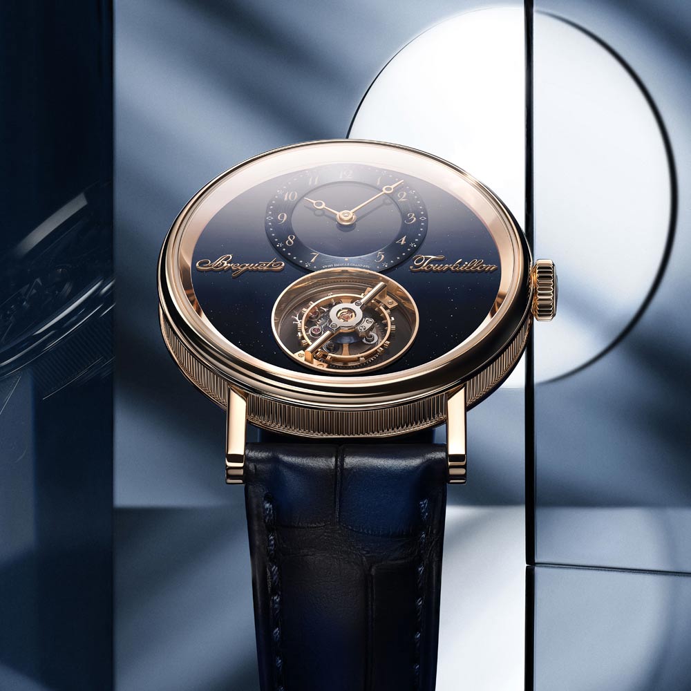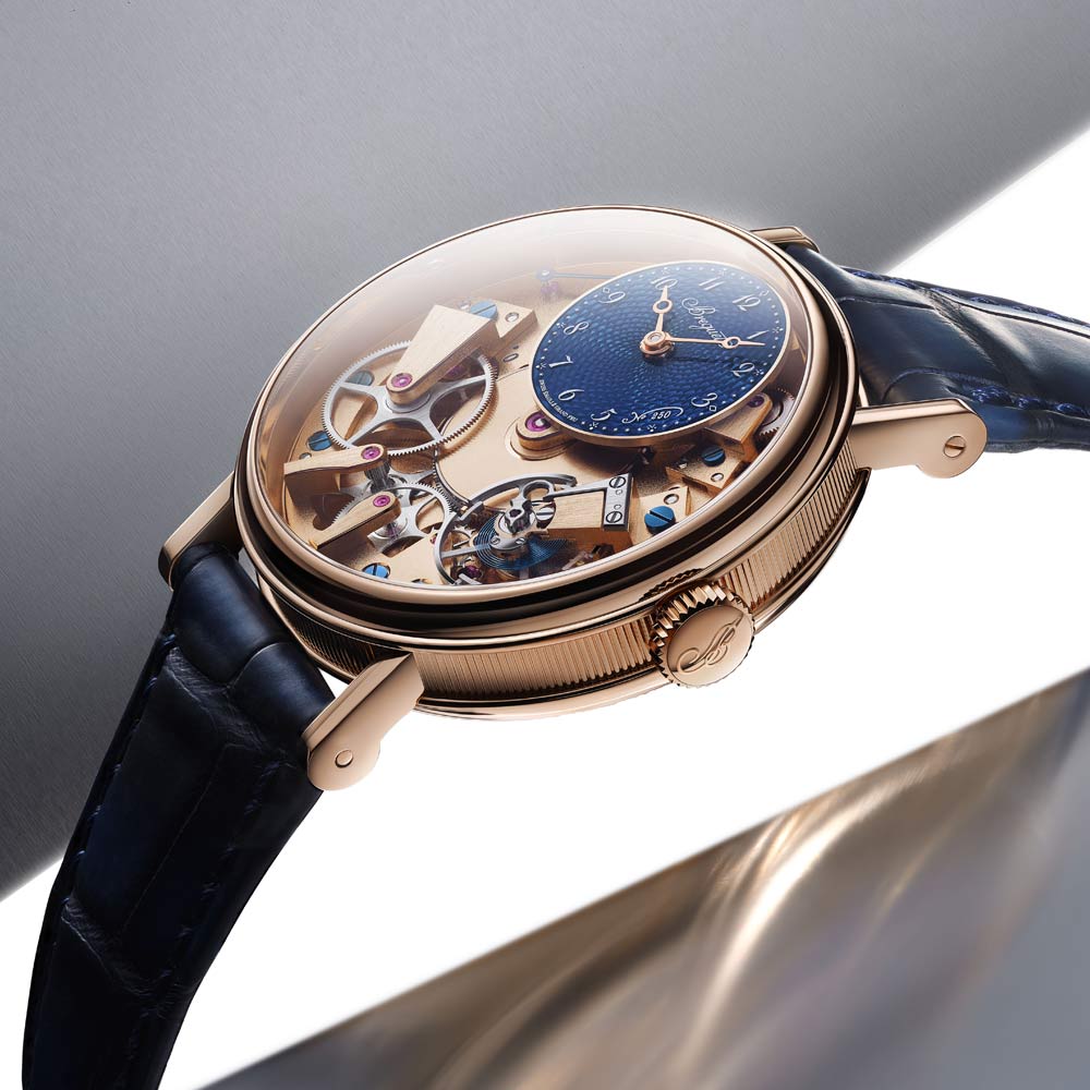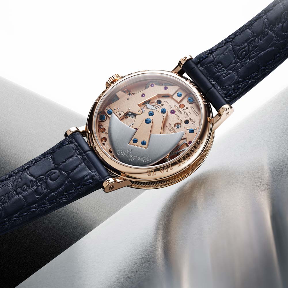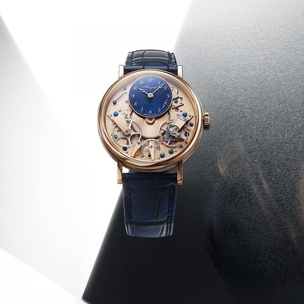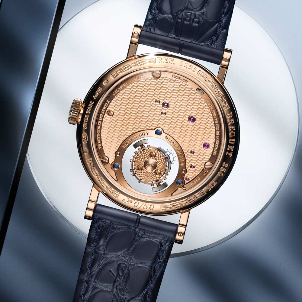Die Tradition 7035 verkörpert die perfekte Verbindung von Breguets 250-jährigem Erbe mit zeitgenössischer Uhrmacherkunst. Ihr markantes, architektonisches Design legt das Uhrwerk sichtbar offen, während das handgefertigte, durchscheinende Grand-Feu-Emaillezifferblatt in Breguet-Blau die retrograde Sekundenanzeige und die klassische Stunden- und Minutenanzeige gekonnt in Szene setzt. Zum Jubiläum präsentiert Breguet erstmals die exklusive Breguet-Gold-Legierung im 38-mm-Gehäuse, die mit den satinveredelten Brücken, gebläuten Schrauben und rubinroten Edelsteinen einen harmonischen Kontrast bildet. Das neue Guillochier-Motiv „Quai de l’Horloge“ auf dem Zifferblatt nimmt die Linien der Seine und die historische Karte von Paris als Inspirationsquelle, während die Platin-Schwungmasse auf der Rückseite an die ersten Kreationen von Abraham-Louis Breguet erinnert. So verschmelzen auf elegante Weise Tradition, Technik und künstlerische Raffinesse in einem modernen Jubiläumsmodell.
