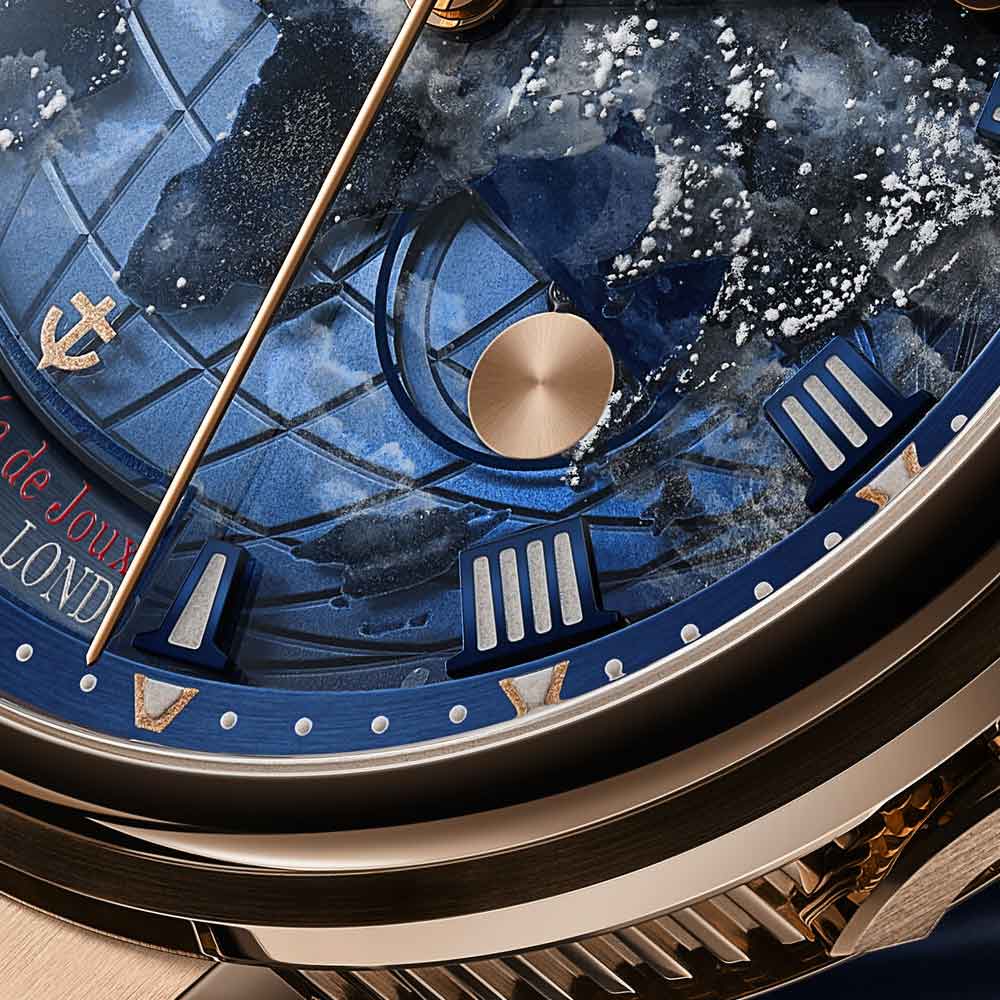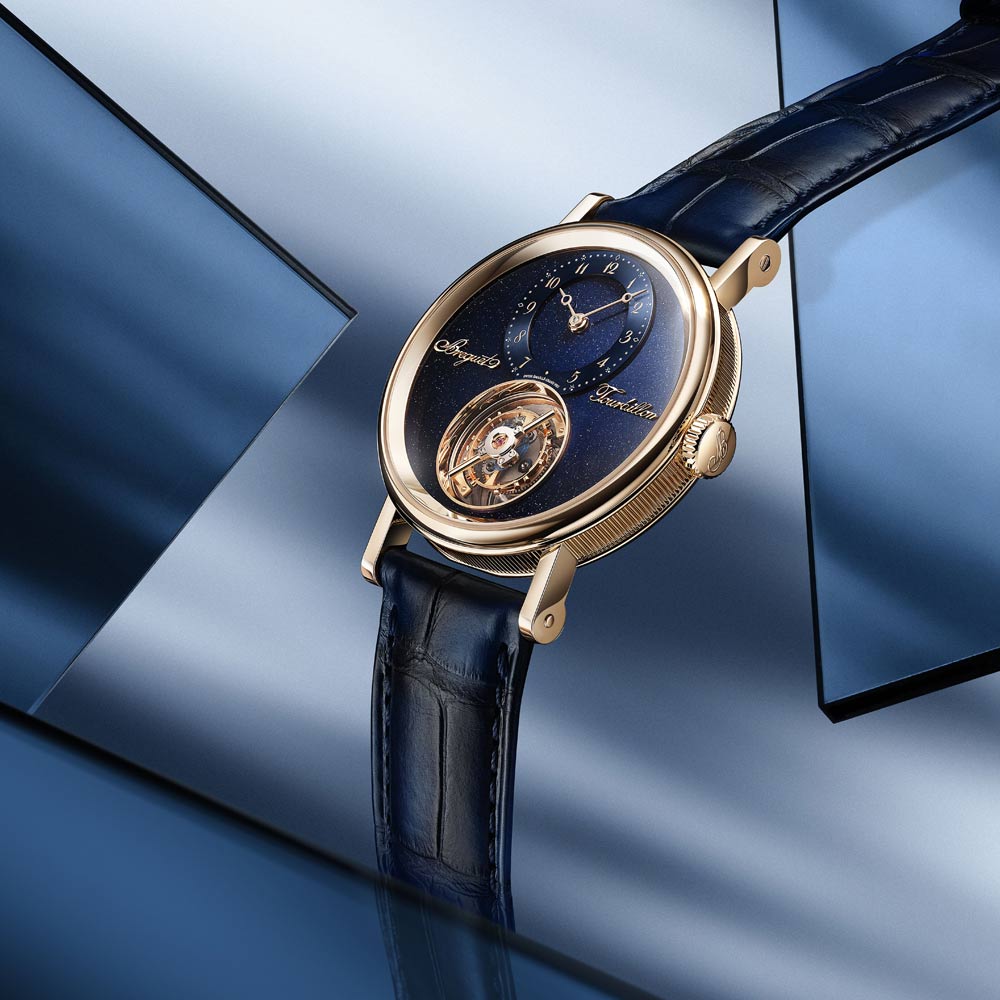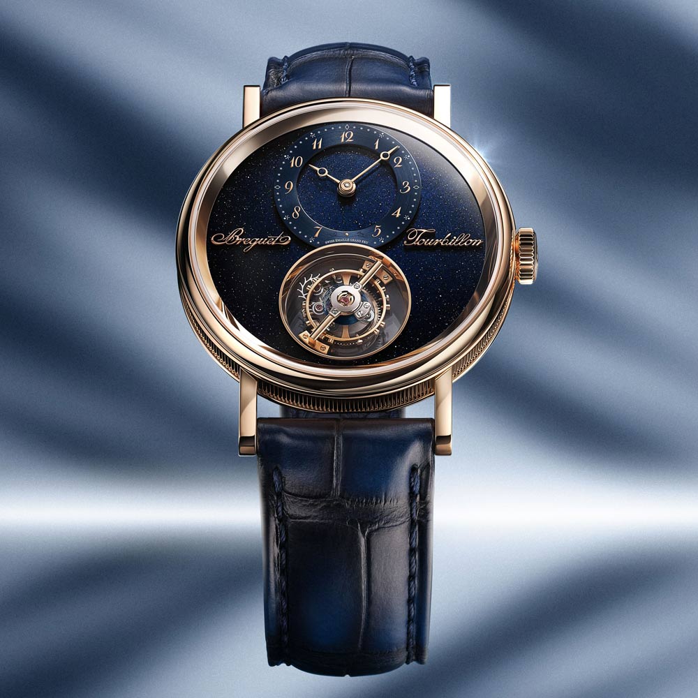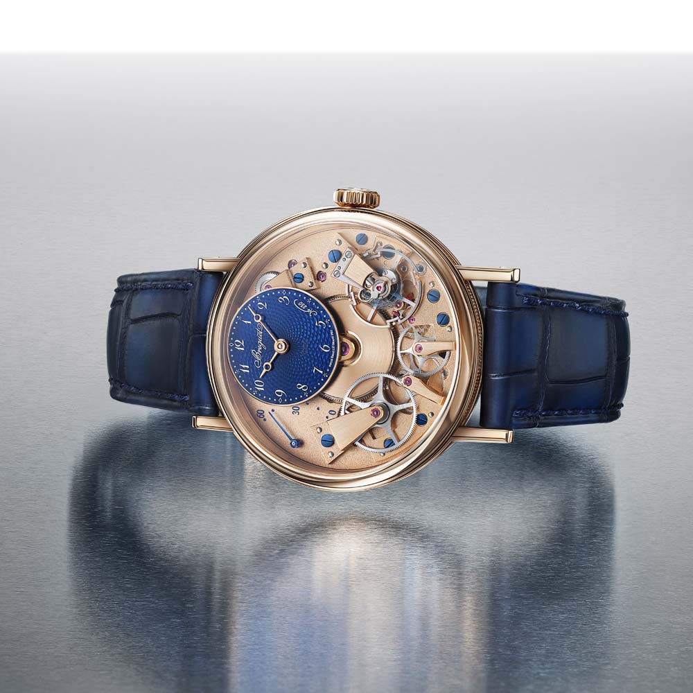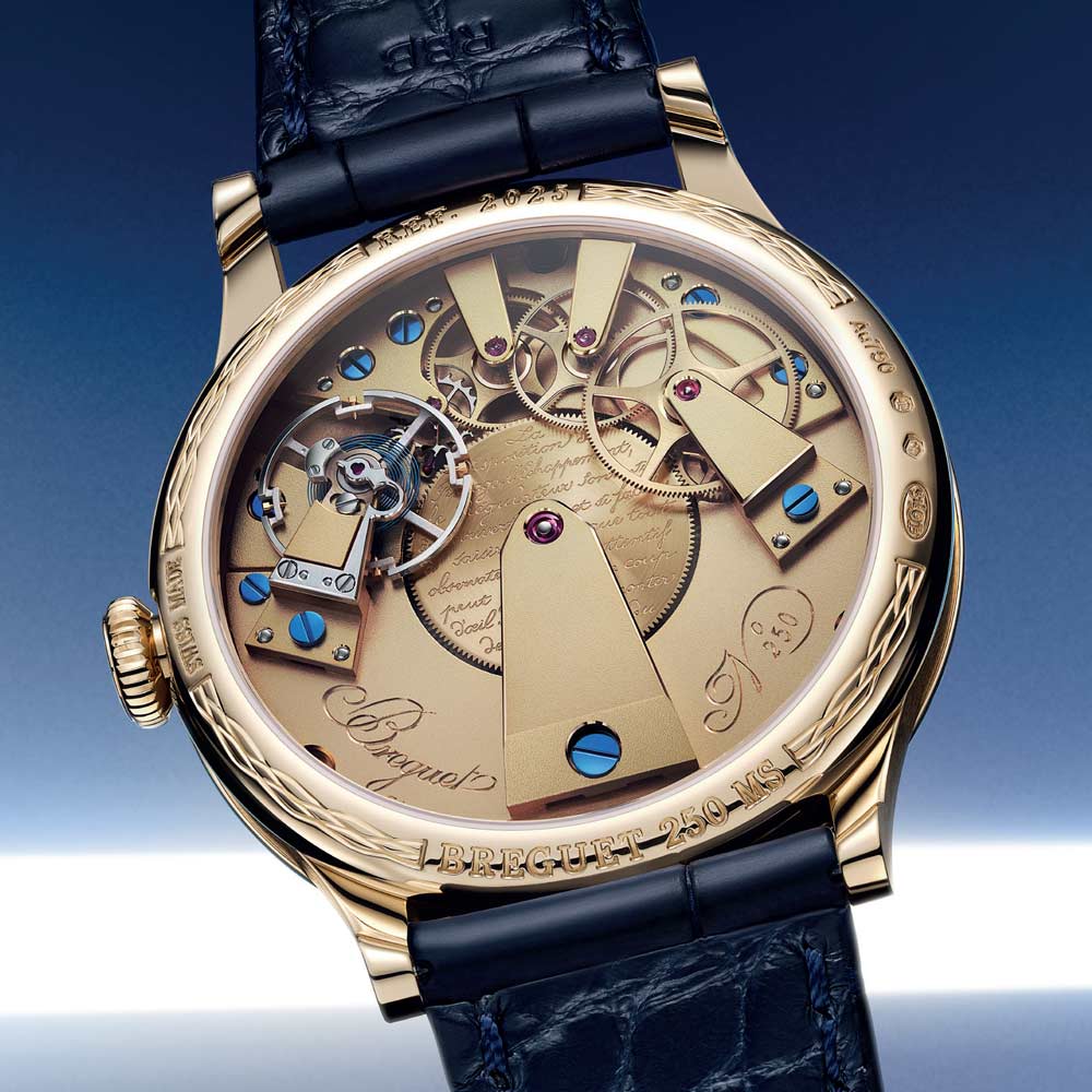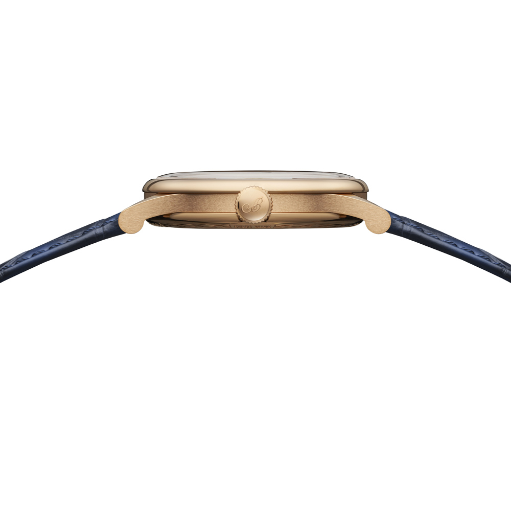 Die Tradition 7035 verkörpert die perfekte Verbindung von Breguets 250-jährigem Erbe mit zeitgenössischer Uhrmacherkunst. Ihr markantes, architektonisches Design legt das Uhrwerk sichtbar offen, während das handgefertigte, durchscheinende Grand-Feu-Emaillezifferblatt in Breguet-Blau die retrograde Sekundenanzeige und die klassische Stunden- und Minutenanzeige gekonnt in Szene setzt. Zum Jubiläum präsentiert Breguet erstmals die exklusive Breguet-Gold-Legierung im 38-mm-Gehäuse, die mit den satinveredelten Brücken, gebläuten Schrauben und rubinroten Edelsteinen einen harmonischen Kontrast bildet. Das neue Guillochier-Motiv „Quai de l’Horloge“ auf dem Zifferblatt nimmt die Linien der Seine und die historische Karte von Paris als Inspirationsquelle, während die Platin-Schwungmasse auf der Rückseite an die ersten Kreationen von Abraham-Louis Breguet erinnert. So verschmelzen auf elegante Weise Tradition, Technik und künstlerische Raffinesse in einem modernen Jubiläumsmodell.