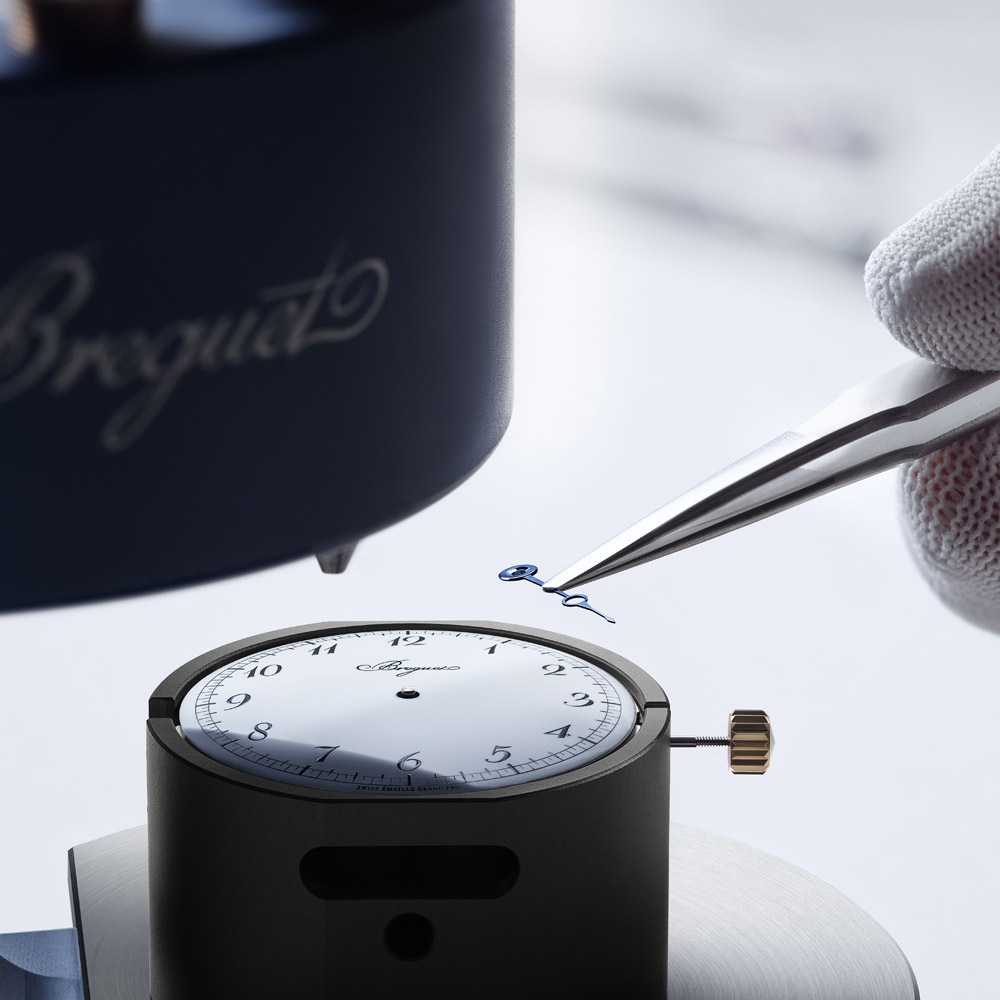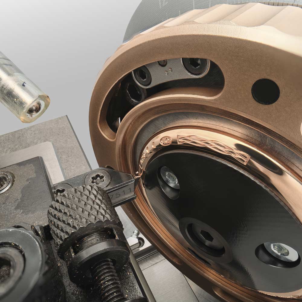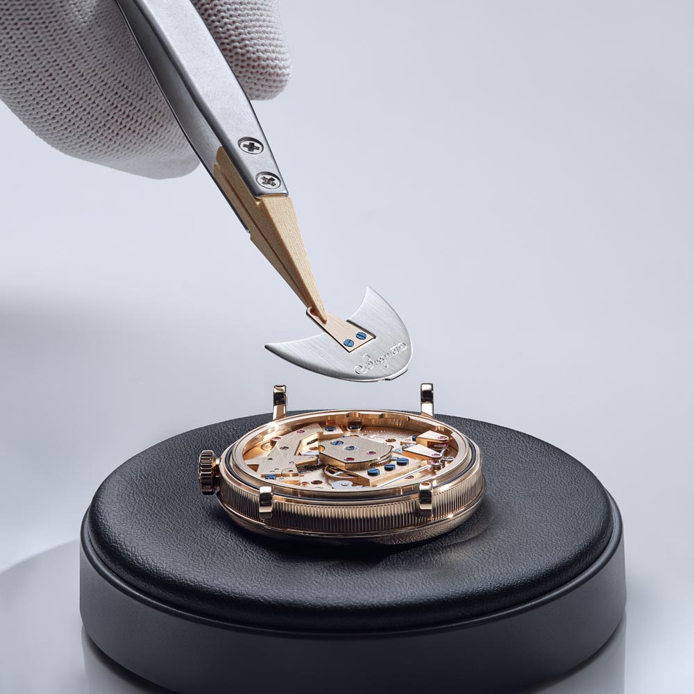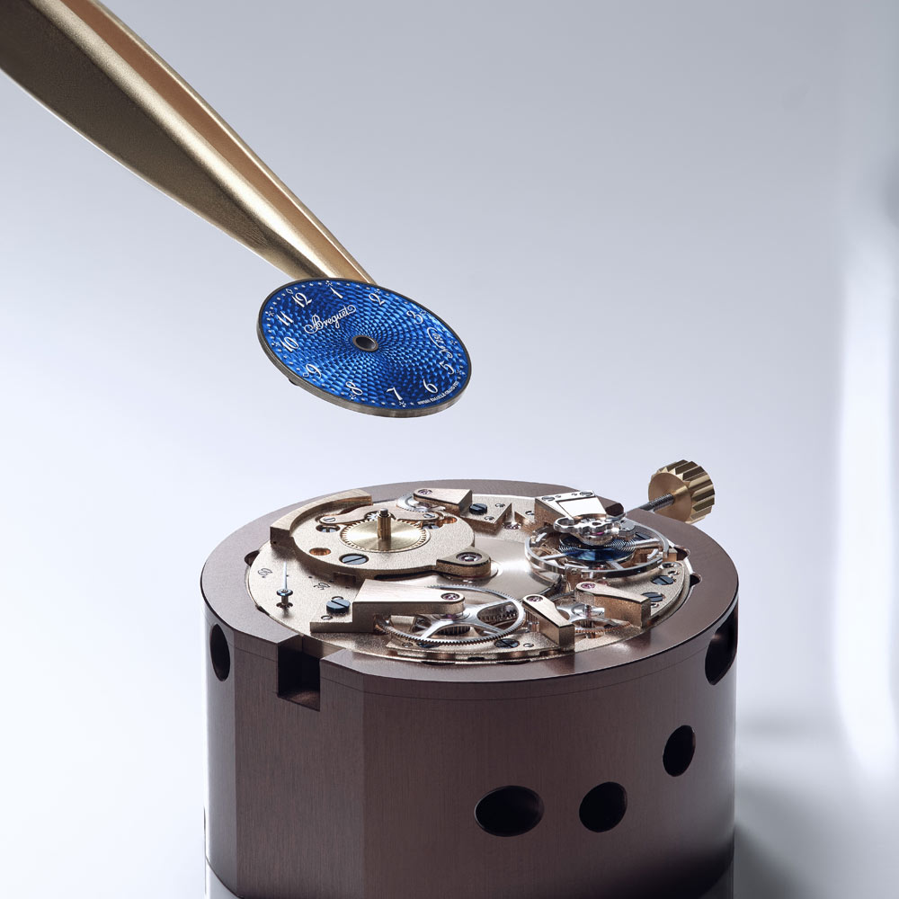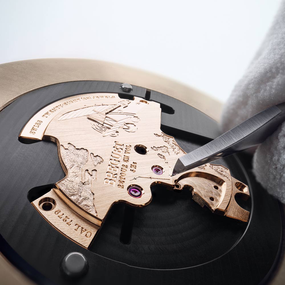 Die Tradition 7035 verkörpert die perfekte Verbindung von Breguets 250-jährigem Erbe mit zeitgenössischer Uhrmacherkunst. Ihr markantes, architektonisches Design legt das Uhrwerk sichtbar offen, während das handgefertigte, durchscheinende Grand-Feu-Emaillezifferblatt in Breguet-Blau die retrograde Sekundenanzeige und die klassische Stunden- und Minutenanzeige gekonnt in Szene setzt. Zum Jubiläum präsentiert Breguet erstmals die exklusive Breguet-Gold-Legierung im 38-mm-Gehäuse, die mit den satinveredelten Brücken, gebläuten Schrauben und rubinroten Edelsteinen einen harmonischen Kontrast bildet. Das neue Guillochier-Motiv „Quai de l’Horloge“ auf dem Zifferblatt nimmt die Linien der Seine und die historische Karte von Paris als Inspirationsquelle, während die Platin-Schwungmasse auf der Rückseite an die ersten Kreationen von Abraham-Louis Breguet erinnert. So verschmelzen auf elegante Weise Tradition, Technik und künstlerische Raffinesse in einem modernen Jubiläumsmodell.