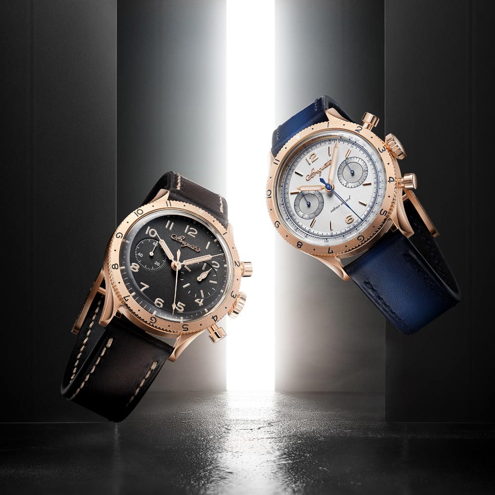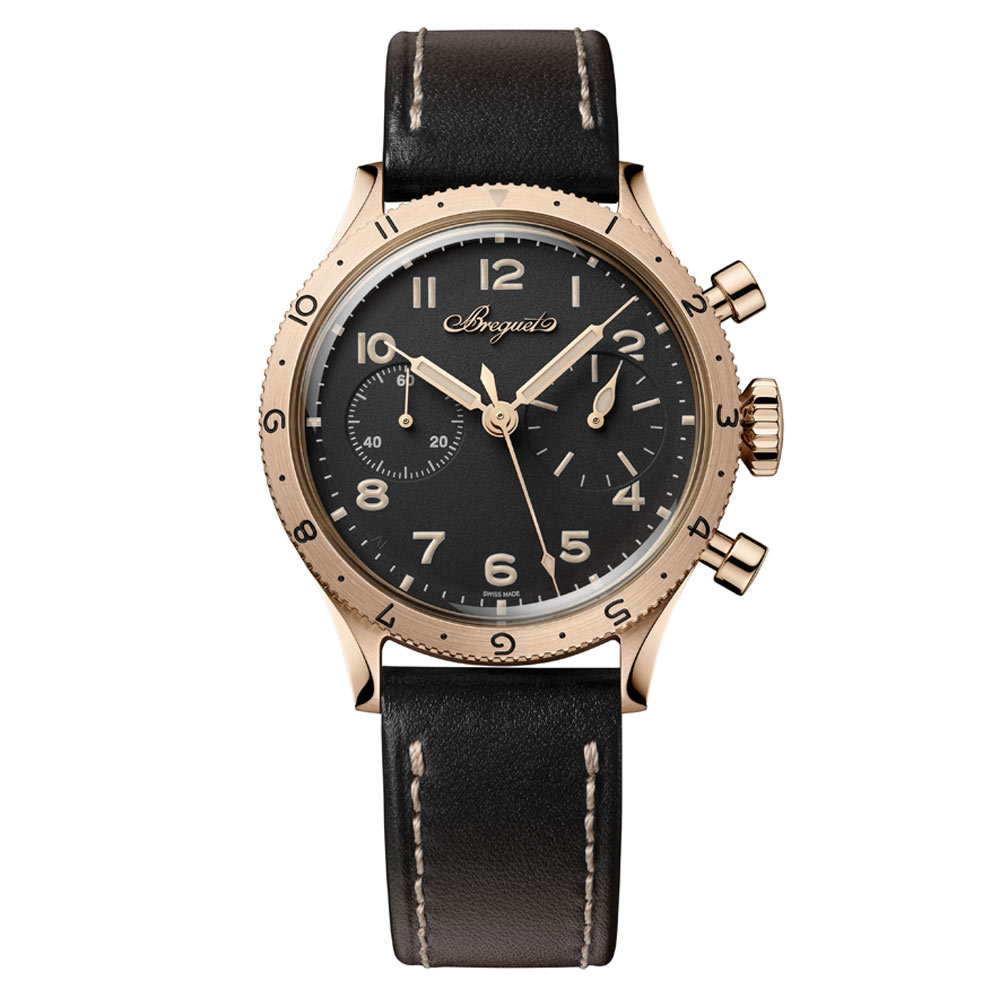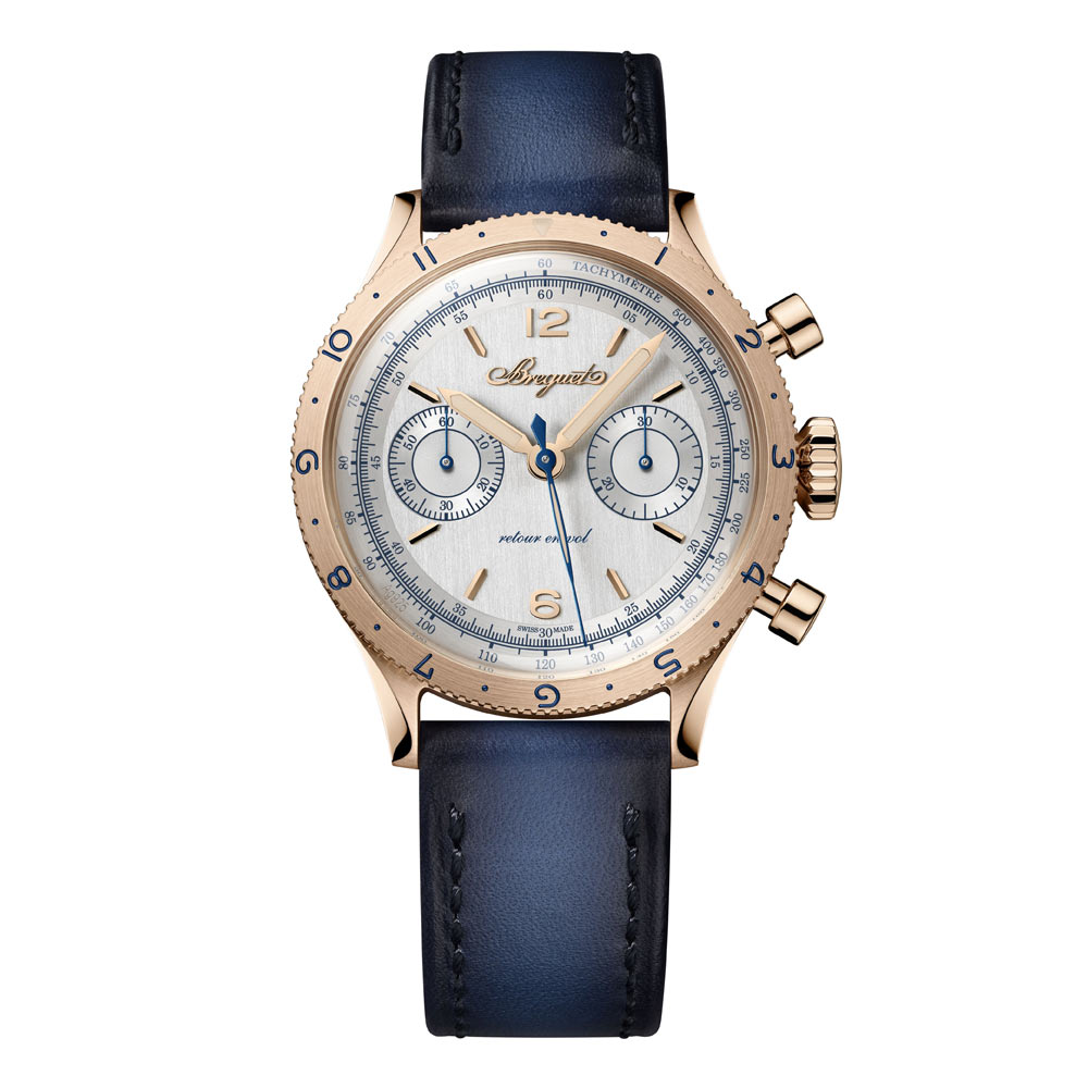 Inspiriert vom zivilen Modell von 1955 präsentiert sich die neue Type XX Referenz 2075 mit einem 38,3-mm-Gehäuse aus 18 Karat Breguet-Gold, Saphirglasboden und Handaufzugskaliber mit Flyback-Funktion, kleiner Sekunde, 30-Minuten-Zähler und Tachymeterskala. Zur Wahl stehen ein tiefschwarzes Zifferblatt aus eloxiertem Aluminium – eine Premiere für Breguet – oder eine auf 250 Exemplare limitierte Version mit massivem 925er Silberzifferblatt und applizierten Indizes aus 18 Karat Gold. Leuchtende Zeiger, austauschbare Kalbslederbänder und eine Gravur der Atlantiküberquerung von 1930 runden das sportlich-elegante Profil ab. Wasserdicht bis 5 bar.