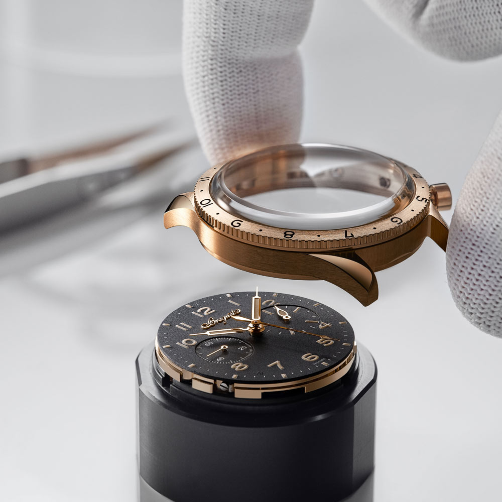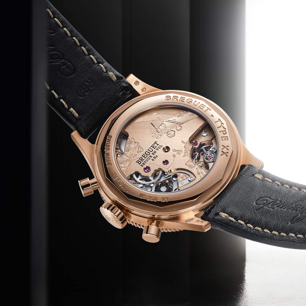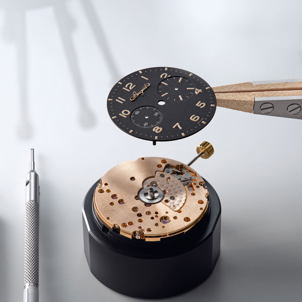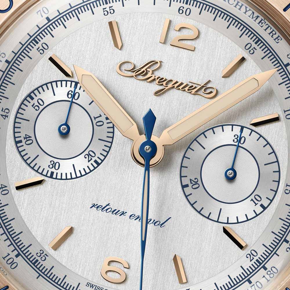 Inspiriert vom zivilen Modell von 1955 präsentiert sich die neue Type XX Referenz 2075 mit einem 38,3-mm-Gehäuse aus 18 Karat Breguet-Gold, Saphirglasboden und Handaufzugskaliber mit Flyback-Funktion, kleiner Sekunde, 30-Minuten-Zähler und Tachymeterskala. Zur Wahl stehen ein tiefschwarzes Zifferblatt aus eloxiertem Aluminium – eine Premiere für Breguet – oder eine auf 250 Exemplare limitierte Version mit massivem 925er Silberzifferblatt und applizierten Indizes aus 18 Karat Gold. Leuchtende Zeiger, austauschbare Kalbslederbänder und eine Gravur der Atlantiküberquerung von 1930 runden das sportlich-elegante Profil ab. Wasserdicht bis 5 bar.