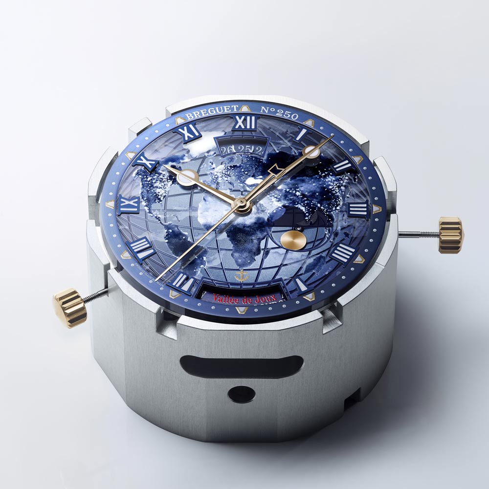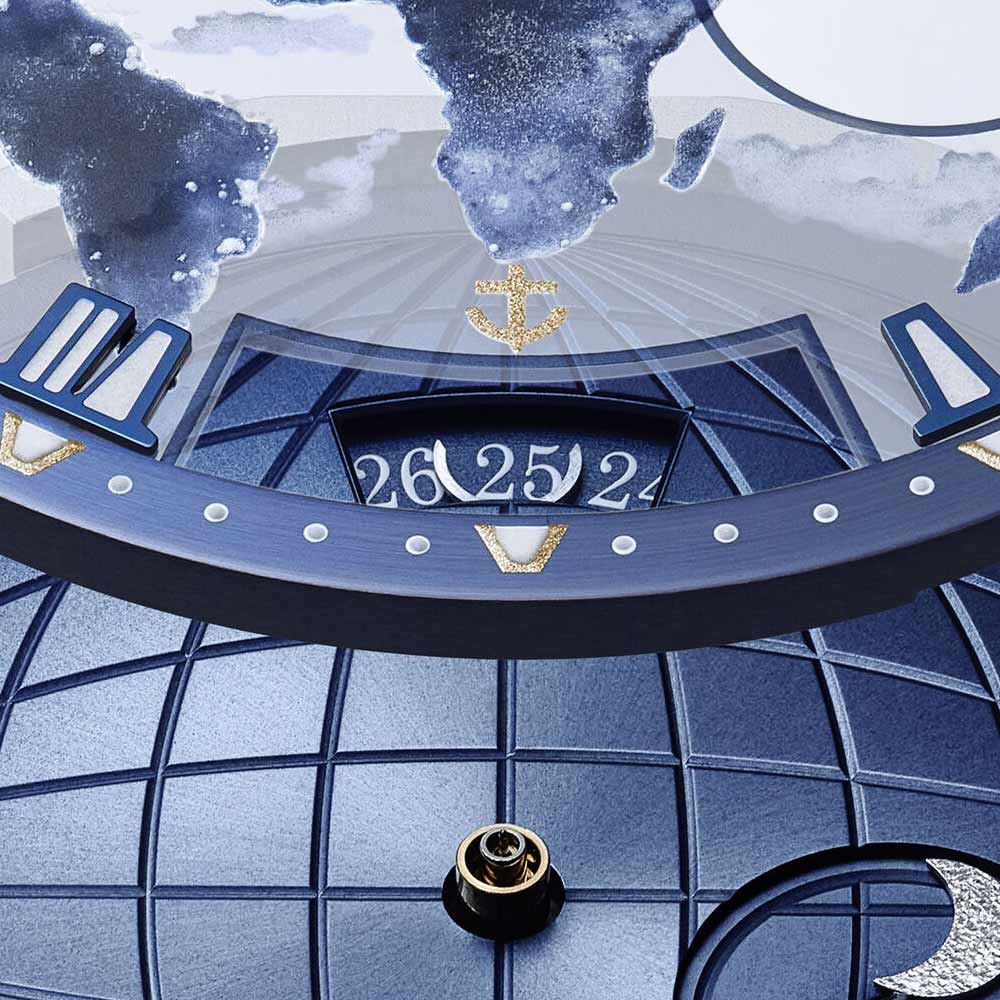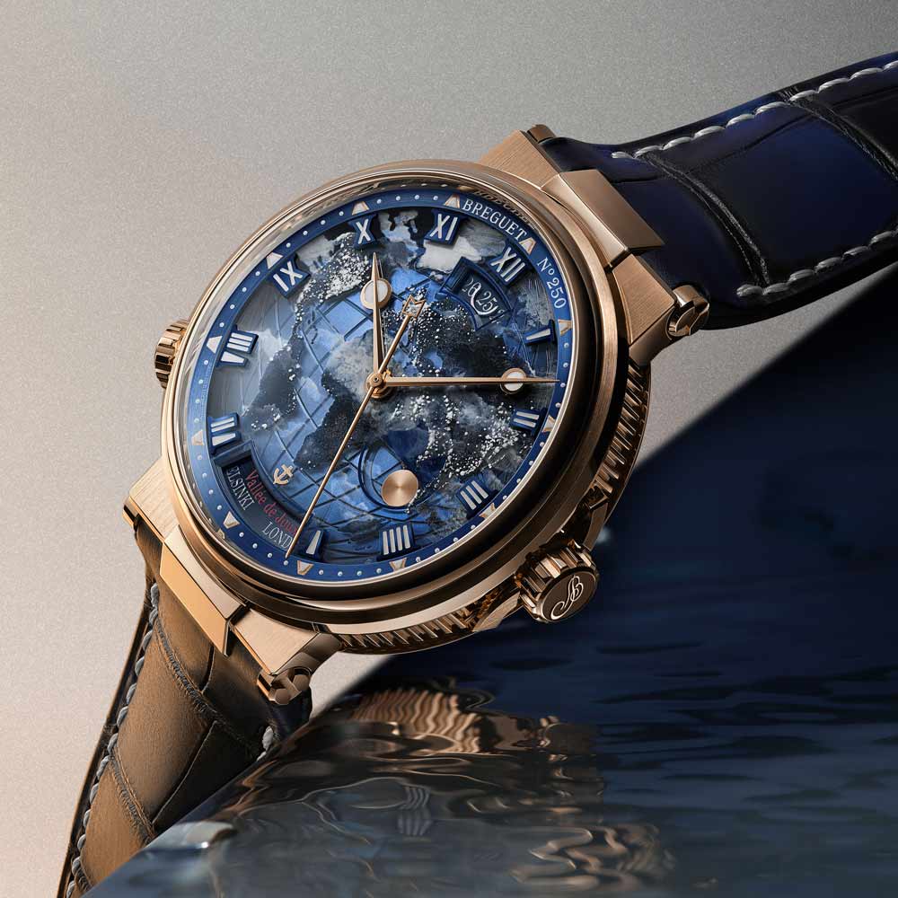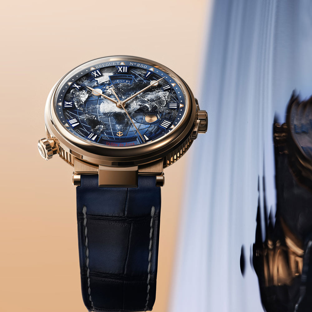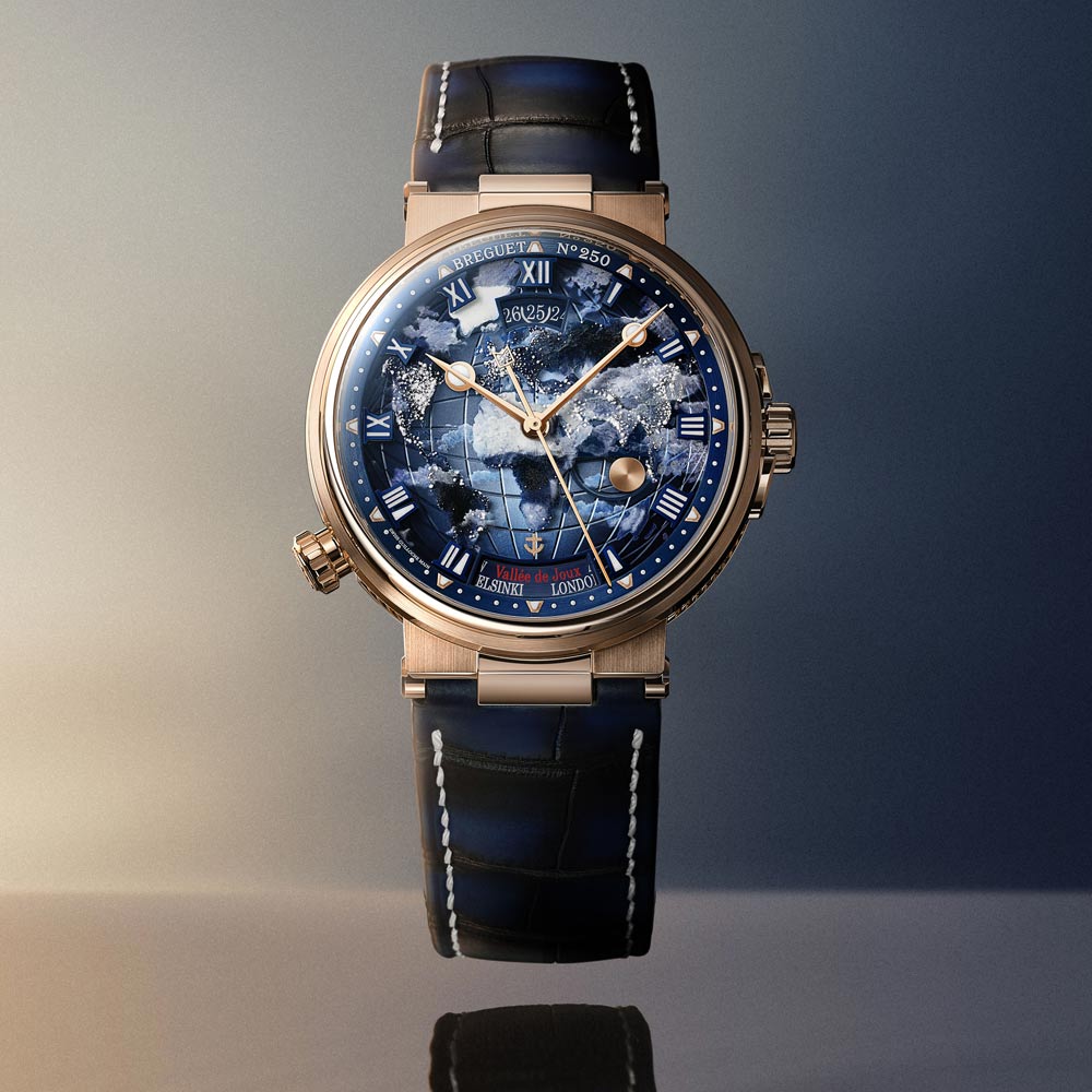 Die neue Marine Hora Mundi 5555 ist ein außergewöhnlicher Zeitmesser für Reisende und Entdecker. Ihr Zifferblatt besteht aus zwei Ebenen: einer guillochierten Goldbasis und einer Saphirscheibe, die in aufwendiger Miniaturmalerei die Erde bei Nacht zeigt – inspiriert von der NASA-Aufnahme „Black Marble“. Phosphoreszierendes Emaille lässt die Stadtlichter im Dunkeln erstrahlen, wodurch jedes Zifferblatt zum Unikat wird. Erstmals wird die Hora Mundi in der hauseigenen Legierung Breguet-Gold gefertigt. Im Inneren arbeitet das patentierte Kaliber 77F1 mit augenblicklichem Wechsel zwischen zwei Zeitzonen sowie synchronisiertem Datum und Tag-/Nachtanzeige. Limitiert auf 50 Exemplare, verbindet die Marine Hora Mundi 5555 höchste Handwerkskunst mit innovativer Technik und einer Hommage an unseren Planeten.