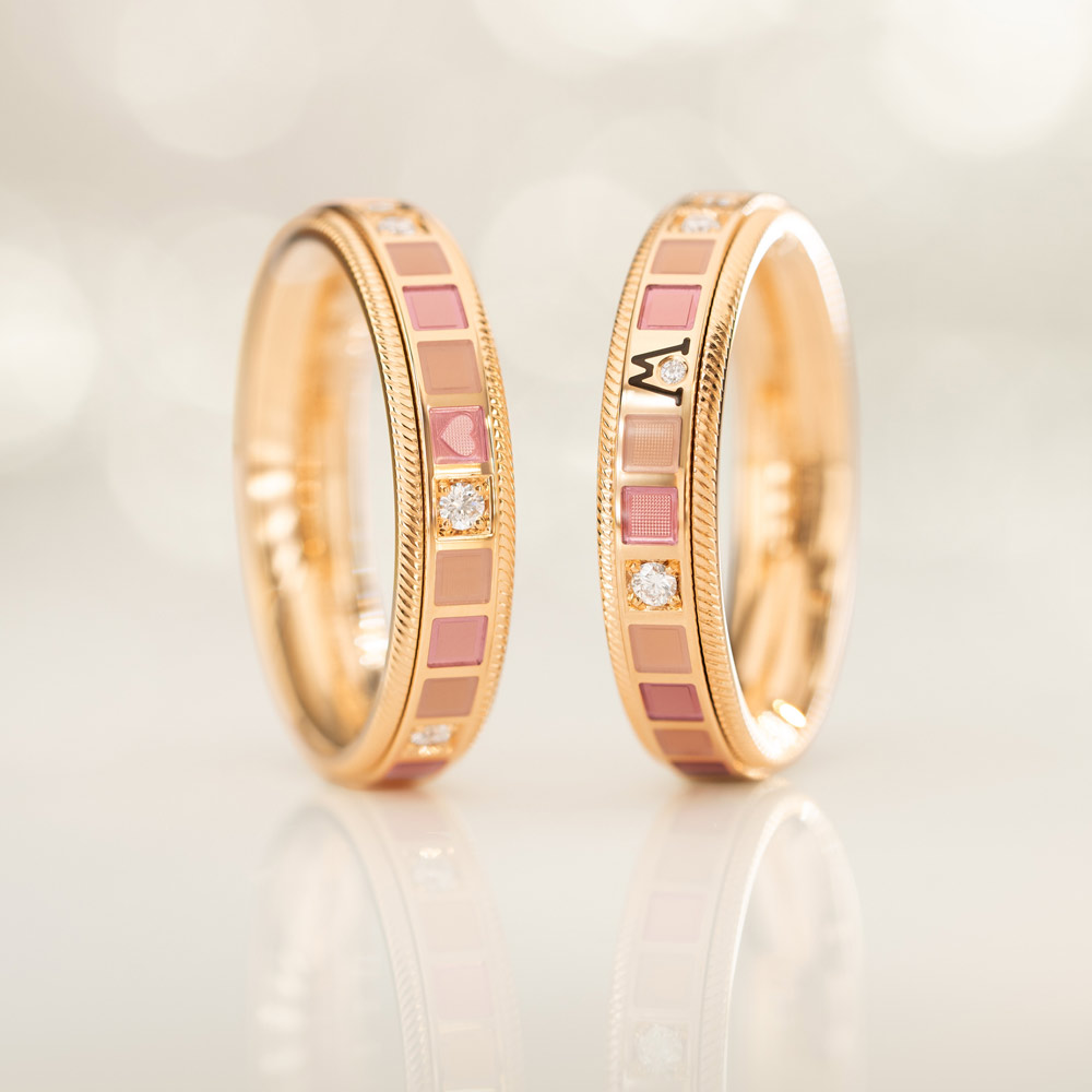 Die Farbpalette der Wellendorff-Kaltemaille wurde um zarte Nude-Töne erweitert, die von einem dezenten Rosé bis hin zu einem anmutigen Terrakotta-Pink reichen. Diese neuen mit glitzerndem Sternenstaub veredelten Kaltemaillefarben harmonieren perfekt mit dem 18-karätigen Gold und den Brillanten und zaubern einen zurückhaltenden eleganten Look.
