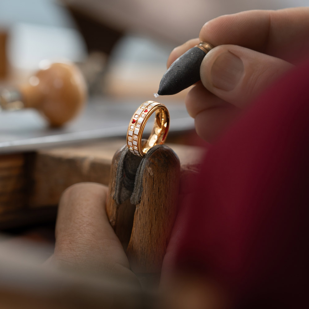 Der Wellendorff-Kaltemaille in Nude-Tönen werden winzige Kristallpartikel beigemischt, die im Licht wie Sternenstaub funkeln. Sorgfältig tragen die Kaltemaille-Künstlerinnen die Farben in mehreren Schichten von Hand auf die einzelnen Mosaike des Rings auf.
